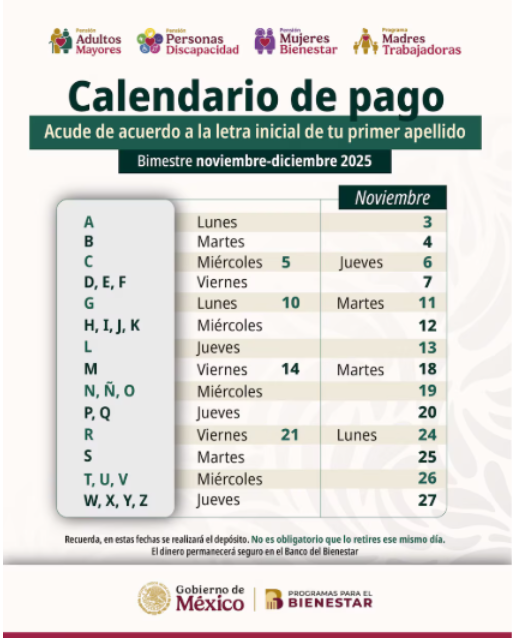Este calendario aplica también para otros programas como la Pensión Mujeres Bienestar, Pensión Adultos Mayores y el Programa Madres Trabajadoras: